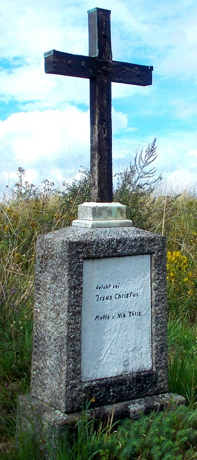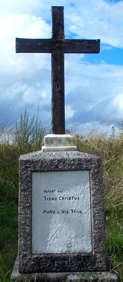 Das Dankeskreuz an der Abzweigung zum Wasserhochbehälter erinnert an die glückliche Heimkehr von Matthias und Nikolaus Theis aus dem 1. Weltkrieg 1914-18. [1]