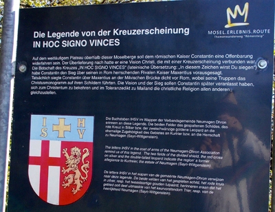 Auf dem weitläufigem Plateau oberhalb dieser Moselberge soll dem römischen Kaiser Constantin eine Offenbarung widerfahren sein. Der Überlieferung nach hatte er eine Vision Christi, die mit einer Kreuzerscheinung verbunden war.