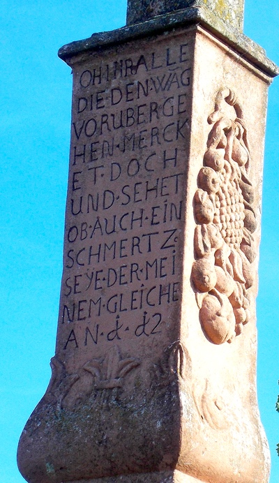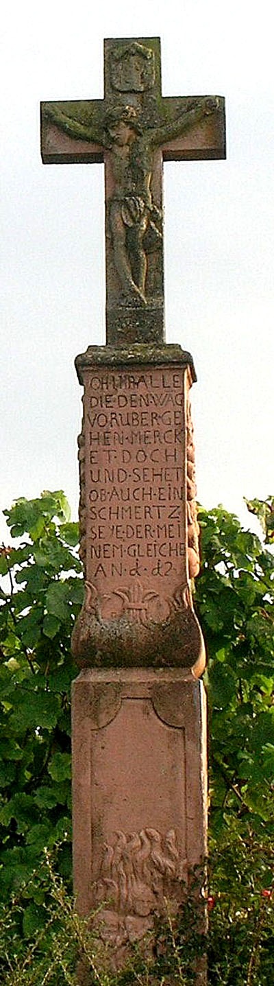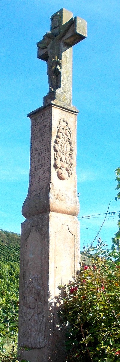 Wegekreuz südöstlich des Ortes in den Weinbergen. Barockes Schaftkreuz, stark restauriert und neu bezeichnet 1752. [1]