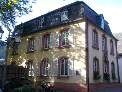 Bruchsteinbau des 18. Jahrhunderts mit dreiachsiger Straßenfront, die durch Rocaillekartuschen und zierliche Masken auf den Fensterschlußsteinen und der Hausmarke über der ehemaligen Haustüre sehr fein gegliedert erscheint. [1]