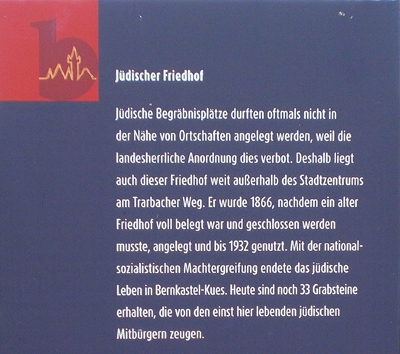 Jüdische Begräbnisplätze durften oftmals nicht in der Nähe von Ortschaften angelegt werden, weil die landesherrliche Anordnung dies verbot. Deshalb liegt auch dieser Friedhof weit außerhalb des Stadtzentrums am Trarbacher Weg. Er wurde 1866, nachdem ein alter Friedhof voll belegt war und geschlossen werden musste, angelegt und bis 1932 genutzt. Mit der national-sozialistischen Machtergreifung endete das jüdische Leben in Bernkastel-Kues. Heute sind noch 33 Grabsteine erhalten, die von den einst hier lebenden jüdischen Mitbürgern zeugen. [2]