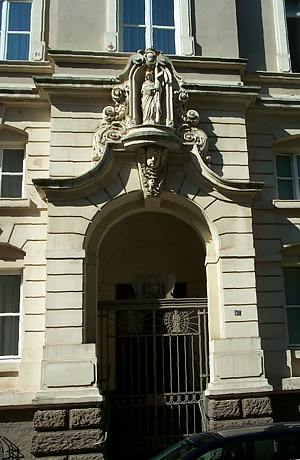 Die asymmetrische Großgliederung bewirken ein dreiachsiger, nur knapp vorgezogener und ähnlich einem Kopfpavillon gestalteter Seitenrisalit im Westen und ein Eingangsrisalit in der zweiten Ostachse. Blickfang bildet der hohe, verdachte und von einer Figurennische auszugartig übergriffene Bogeneingang. Zur originalen Ausstattung der straßenbildprägenden Fassade zählen das Eisengitter vor der kuppelgewölbten Eingangsvorhalle und das zweiflügelige Türblatt.