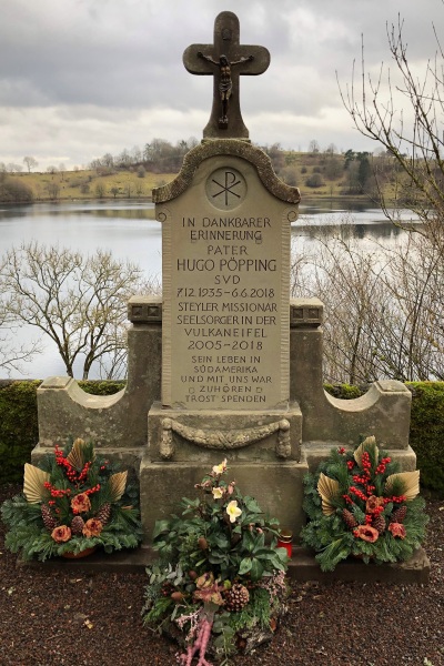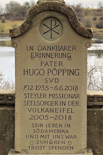 Auf dem Friedhof Weinfeld der Gemeinde Schalkenmehren, am Rande des Weinfelder Maares, hat Pater Hugo Pöpping eine besondere Würdigung erfahren. Nahe einer Bank an der Umfassungsmauer, auf der Pater Pöpping die Stille und den besonderen Ort "Weinfeld" mit seinem Kirchlein genoß, hat die Gemeinde Schalkenmehren einen Gedenkstein für den verstorbenen und beliebten Steyler Missionar aufstellen lassen. Ein alter Familiengrabstein wurde restauriert und erinnert nun an Pater Pöpping, der mehr als 13 Jahre als Seelsorger in der Eifel segensreich tätig war, so auch in Schalkenmehren. Die Inschrift lautet:
