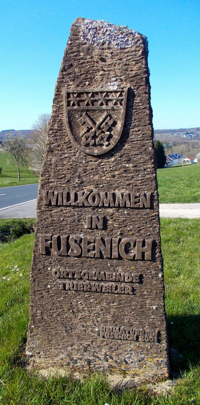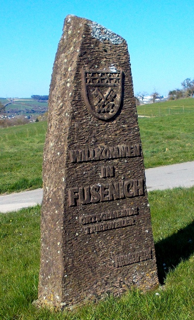 Willkommensstein mit Wappen der Gemeinde Fusenich vor südlichem Ortseingang an der K1 gelegen [1].