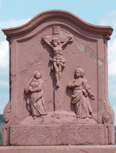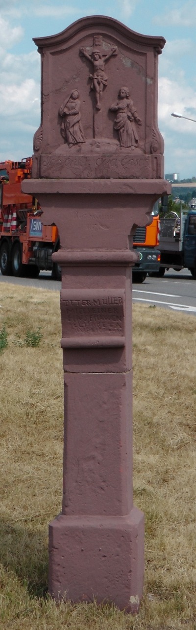 Auf dem Kapitell Renovierungsvermerk 1871, darüber der Bildstock unter geschweiftem Abschlussgesims, in flachem Relief Kruzifix auf einem Berg gerahmt von Maria und Johannes, darunter in Schreibschrift: