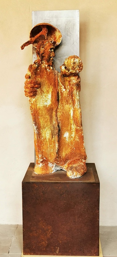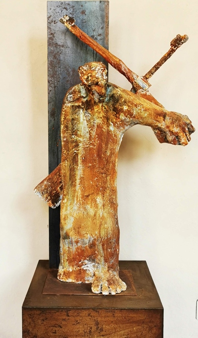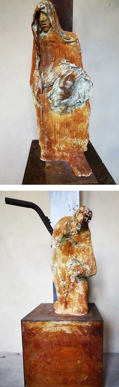 Im Jahr 2015, aufgewühlt durch das damals brandaktuelle Flüchtlingselend, den Klimawandel, die dadurch bedingten Hungersnöte und andere Katastrophen, suchte Monika Stein nach einer Möglichkeit, die auf uns einstürzenden Themen unserer Zeit in ihren Skulpturen auszudrücken. Der Entschluss, einen Kreuzweg zu schaffen, reifte bei dem Gedanken, dass neben Tod, dem wir alle unterworfen sind, auch solche menschengemachten Desaster "das Kreuz" sind, das wir heute zu tragen haben.