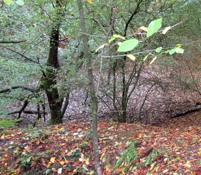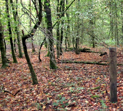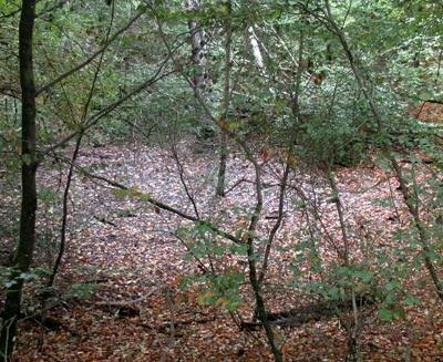 Doline mit Markierunspfosten (D 6) gekennzeichnet, befindet sich ca. 70m dahinter, mit Laub verfüllt. [3]