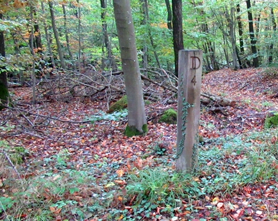 Doline ist mit Markierungspfosten (D 4) gekennzeichnet, befindet sich ca. 90m dahinter, mit Laub verfüllt, schwer zu erkennen. [3]