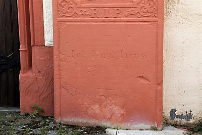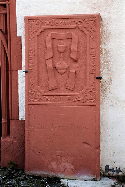 An der Nordseite große Grabplatte für den 1896 verstorbenen Pfarrer Johann Peter Hens. [1]