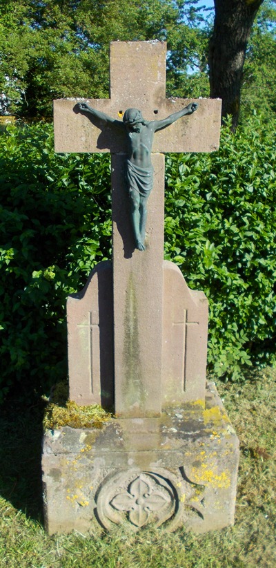 Steinkreuz, Sockel verziert, mit Korpus. [1]