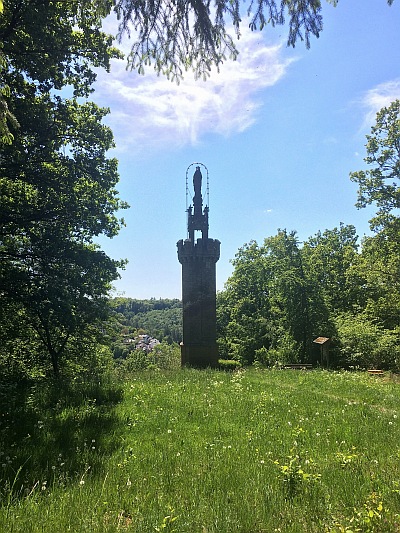 In einer am 9. Juni 1886 stattgefundenen Sitzung des Comites wurde dem Maurermeister Jacob Cronibus der Auftrag der Maurer- und Steinhauerarbeiten respt. die Errichtung des Baues bis an den oberen Teil erteilt. Die Bildhauerarbeiten und die Statue selbst waren schon an den Bildhauermeister P. Quirin vergeben.