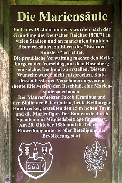 In einer Versammlung des 1875 gegründeten Verschönerungsvereins am 8. Oktober 1885 bei Herrn Fr. Schweizer wurde der Wunsch geäußert, anstelle der bereits abgelehnten Bismarcksäule eine Mariensäule zu bauen. Wenige Wochen später wurde in der Sitzung vom 19. November 1885 der Beschluß gefaßt, eine Mariensäule auf dem Rosenberg zu errichten. Das Mitglied des Vereins, Herr Th. Lano, erklärte hierzu, seine Schwester Ww. Hormann habe sich bereit erklärt, den Platz, wo die Mariensäule erbaut werden soll, unentgeltlich dem Verein zu schenken. Zur Ausführung des Projekts wurde eine Comission bestehend aus den Herren Pastor Müller, F. Wallenborn, P. Quirin, B. Mulljans, W. Schulte und J. Marquet gewählt. Die der Bauverwaltung in Auftrag gegebene Erstellung eines Bauplans fand die Zustimmung der Commision. Daraufhin beschloß der Verein, das Comite soll die Bildhauer-, Steinhauer- und Maurerarbeiten in enger Submision vergeben. In der Sitzung vom 1. Mai 1886 bei Herrn Marquet wurde dem Bildhauer Peter Quirin der Auftrag zu den Bildhauerarbeiten zu folgenden Bedingungen und Preisen erteilt:
