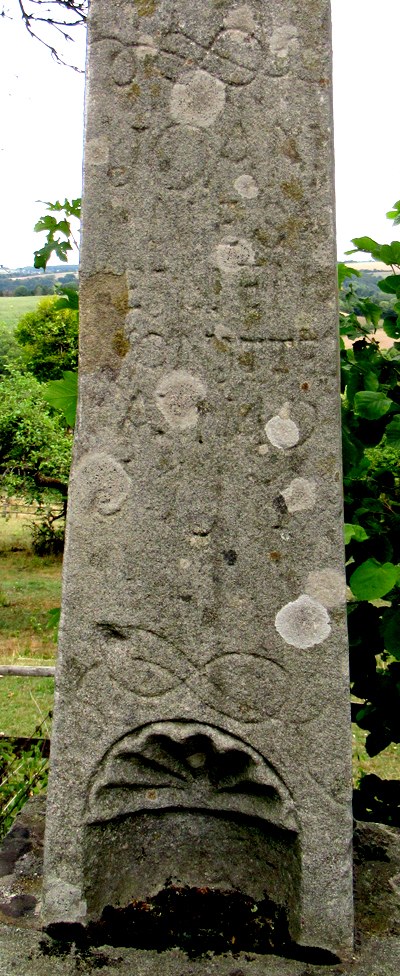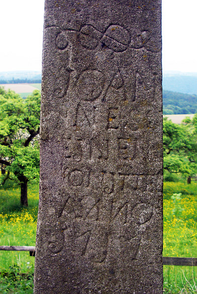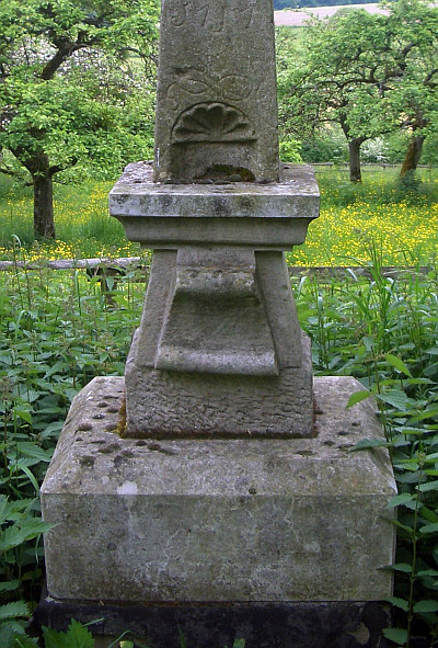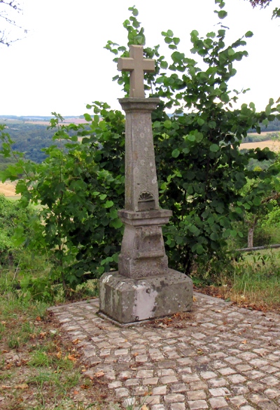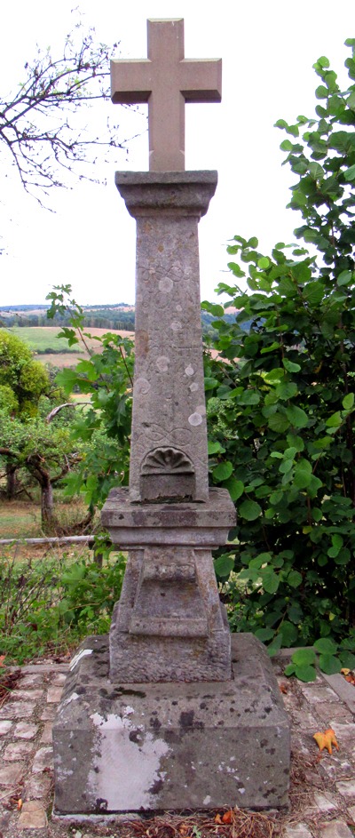 Schaftkreuz aus Sandstein mit kleiner Muschelnische, darüber Inschrift unleserlich, Abschlusskreuz nachträglich aufgesetzt (?). [1]