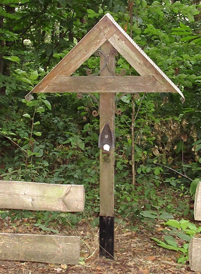Schlichtes Holzkreuz vor der Kapelle am Bienenberg, 2 Rastbänke davor. [1]