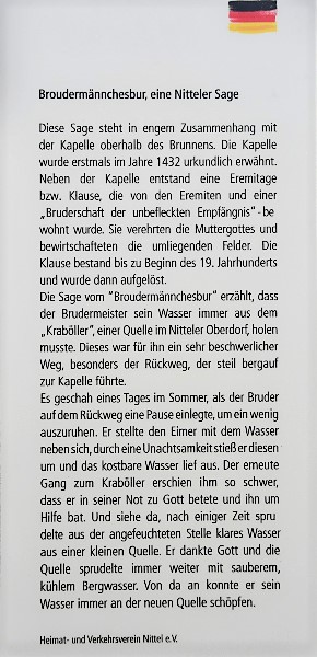 In der Nitteler Ortschronik heißt es, dass möglicherweise Mönche Wasser für ihre Klause aus dieser Quelle geholt haben sollen. Vermutlich eine Legende, denn die Existenz eines Klosters in der Nähe der Nitteler Sankt-Rochus-Kapelle ist nicht belegt. Aber die Bezeichnung "Broudermännchesbur" kommt daher, dass die kleinste Person (Männches) einer Gruppe von Mönchen (Brüdern) diesen Brunnen (Bur) zum Wasserholen genutzt haben soll. [1]
