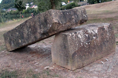 Der luxemburgische Bildhauer Bertrand Ney nimmt in seiner Arbeit "Au bord de l´eau" Bezug auf den Fluss, der Luxemburg und Deutschland voneinander trennt oder miteinander verbindet, je nach Standpunkt des Betrachters. Unmittelbar neben der Anlegestelle der Fähre, die täglich die Menschen hinüber und herüber führt, hat die zweiteilige Arbeit ihren Platz gefunden. Wie ein auf das Ufer gezogenes Boot ruht der große Stein auf dem kleineren. Weiche Wellen überziehen seine Oberfläche. Seine eigentliche Materialität verleugnend gleicht er sich der sanft bewegten Wasserfläche der Mosel an. In den vom Bildhauerwerkzeug in den Stein gegrabenen feinen Spuren und Lineaturen haben sich im Laufe der Zeit bereits erste zarte Moose und Flechten eingenistet, was den Eindruck der Weichheit noch verstärkt. Unwillkürlich denkt man das "panta rhei", denn wie der Fluss und die Umgebung wird auch der Stein einer stetigen natürlichen Veränderung unterworfen. [1]