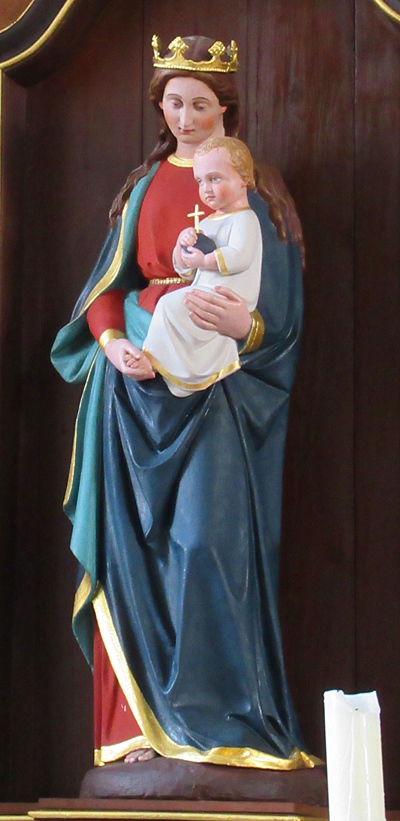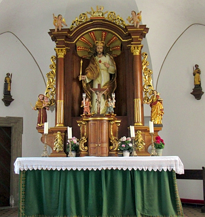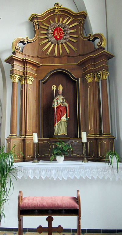 Nördlich der Kirche schließt der 1917 erweiterte Kirchhof an. Am Übergang zum Kirchhof das Friedhofskreuz vom letzten Drittel des 19. Jahrhundert: ca 4 Meter hohe Rundsäule mit Tatzenkreuz. An der Sakristei unter einem Vordach ein steinerner Prozessionsaltar von um 1900. An der Kirche und im Bereich der anschließenden Mauer sind steinerne Grabkreuze des späten 18. und frühen 19. Jahrhunderts eingelassen. Ihre Gestaltung mit Kelchrelief (Priestergrab), IHS-Zeichen, und Kombinationen mit den Wunden Christi und Totenkopf umspannt den zeitgenössischen Glaubenskanon. [2]