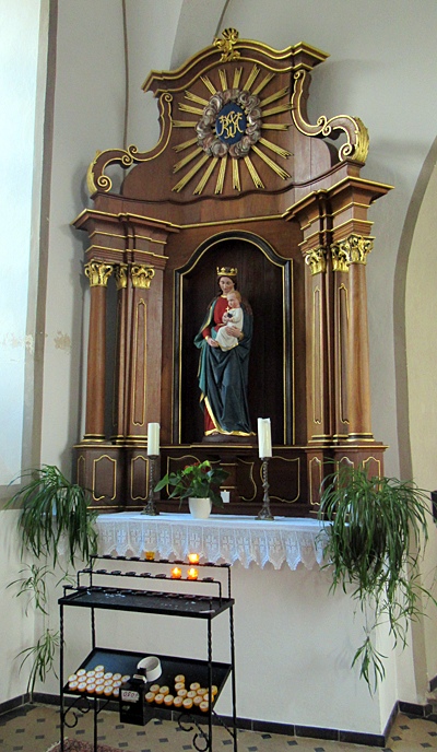 Hoch über dem Ort gelegen. Kleiner kreuzgratgewölbter Saal von 1759. Eingebauter romanischer Turm an der Westseite. [1]