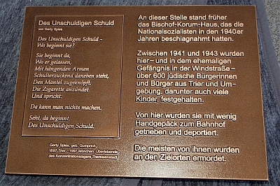 Am Textinhalt der Texttafel arbeitete der Arbeitskreis Nationalsozialismus der AG Frieden Trier tatkräftig mit. Durch das beigefügte Gedicht der in Trier geborenen jüdischen Dichterin Gerty Spies wurde ihr Name in Trier weiteren Kreisen bekannt. [1]