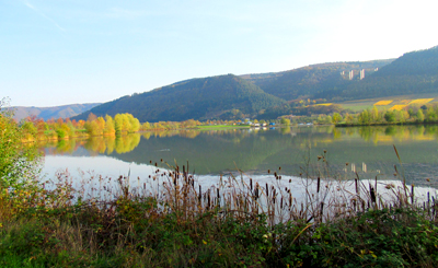Künstlich angelegter See bei Riol mit zahlreichen Freizeitwassersportangeboten, Badestrand, Rodelbahn und Campingplatz anbei. [1]