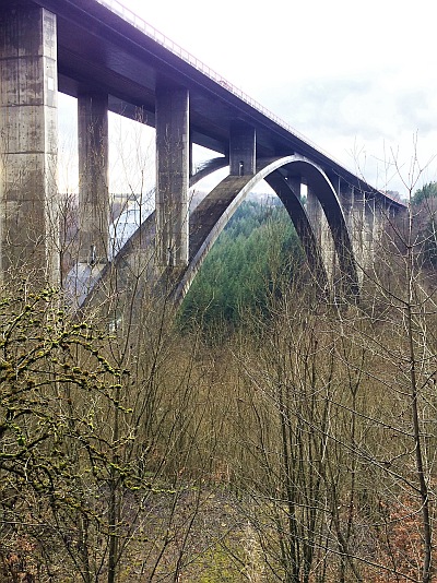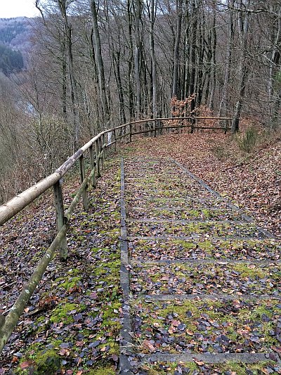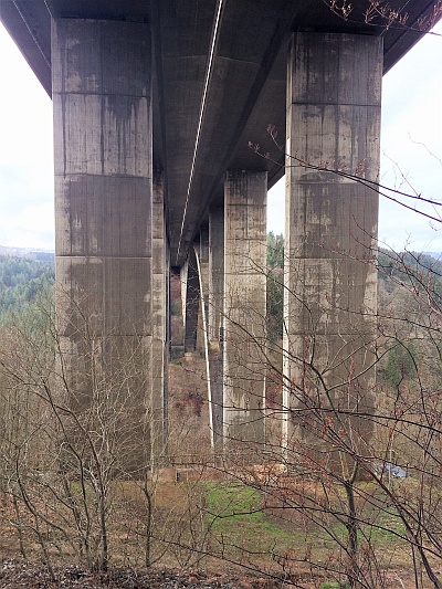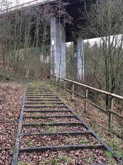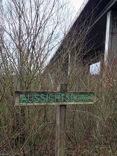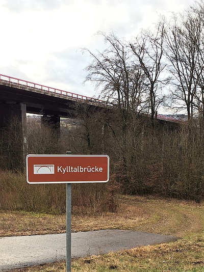Vom Parkplatz an der Kreisstraße 87 aus führt einn Fußweg unter der Kylltalbrücke hindurch zum Aussichtspunkt. [1]