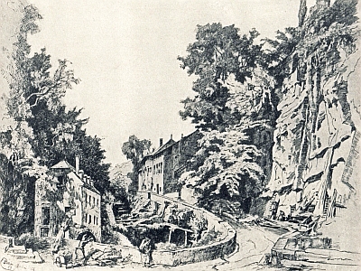Bild 1: Mühle am Eingang ins Busental bei Pallien. Nach einer Zeichnung von August von Wille vom 17. Mai 1876. In: Kentenich "Alt-Trier"Eine künstlerische Bilderfolge. Verlag: Trier, Jacob Lintz, 1920.