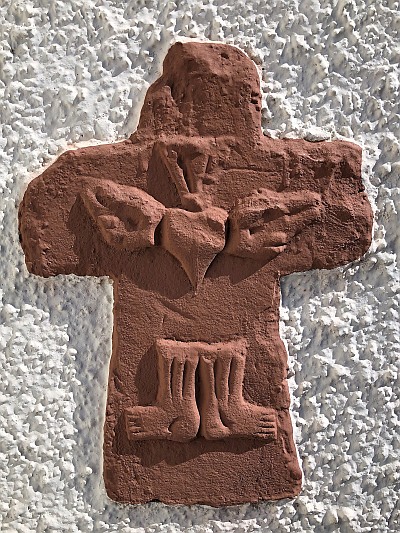 Altes ca. 50 - 60 cm großen Sandsteinkreuzes, mit der Darstellung der Heiligen Wunden. In der Mitte das durchbohrte Herz, unten die durchbohren Füße und oben die Hände mit Wundmalen. Vermutlich handelt es sich um ein altes Friedhofskreuz, das bei der Kirchenrenovierung in die Mauer eingebaut wurde. [1]