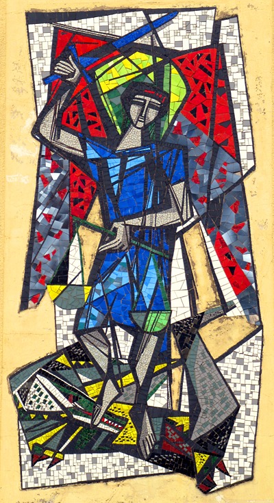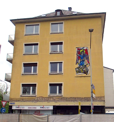 Ein ca. 3m hohes Glasmosaik des Trierer Glasmalers Jakob Schwarzkopf aus dem Jahre 1960, angefertigt an einer Hauswand Ostallee Ecke Gartenfeldstraße, zeigt den Erzengel Michael mit Schwert und Waage.