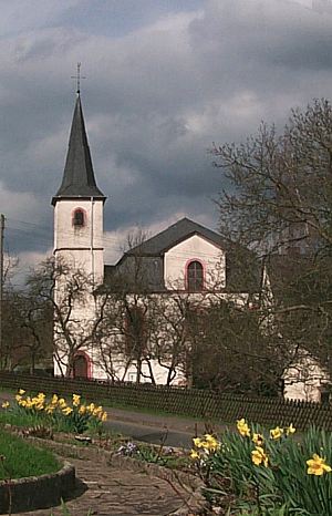Die heutige Kirche besteht aus drei Teilen: dem spätgotischen Chor mit Dreiachtelschluß dem viergeschossigen Westturm mit Schiff von 1741/43, das beim nach Norden ausgerichteten Neubau des Trierer Architekten Peter Marx von Südwand ist noch teilweise in der heutigen Eingangsfront erhalten.