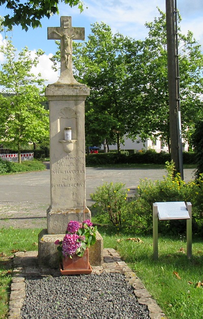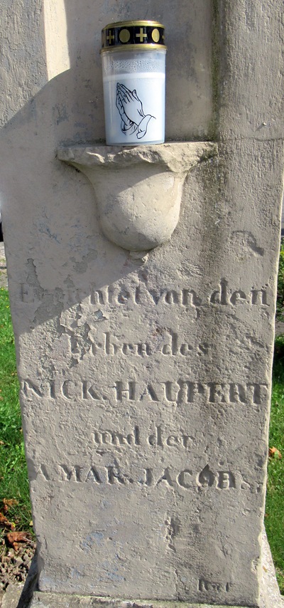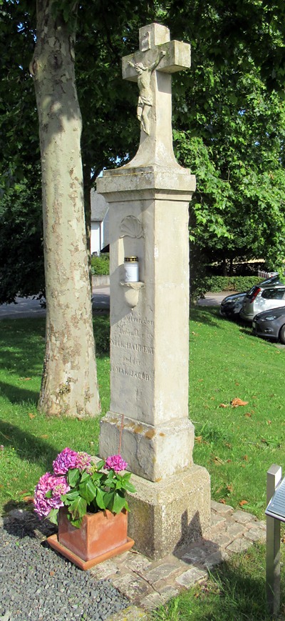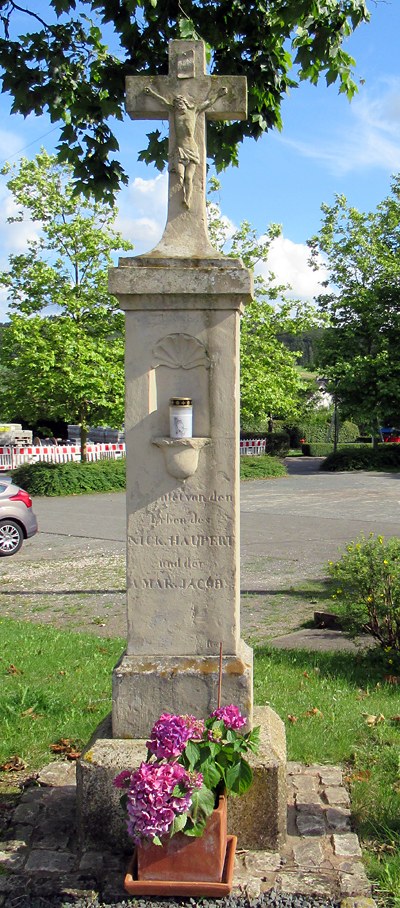Dieses Kreuz ist ein Sandsteinkreuz, 2,15m hoch. Auf dem Schaft eine Nische zur Aufnahme von Blumen. Darunter die Inschrift: "1849 - Errichtet von den Erben des Nikolaus Haupert und der Anna Maria Jacobs". Man erzählt von diesem Kreuz, dass es als Gelöbniskreuz errichtet wurde. [...]