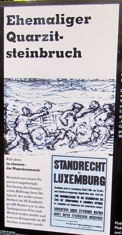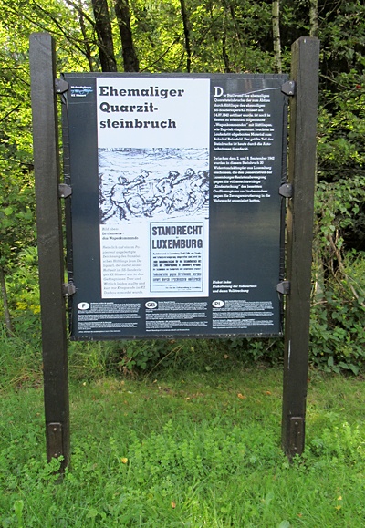 Zwischen dem 2. und 9. September 1942 wurden in diesem Steinbruch 20 Widerstandskämpfer aus Luxemburg erschossen, die den Generalstreik der Luxemburger Resistenzbewegung gegen die völkerrechtswidrige "Eindeutschung" des besetzten Großherzogtums und insbesondere gegen die Zwangsrekrutierung in die Wehrmacht organisiert hatten. [1] [2]