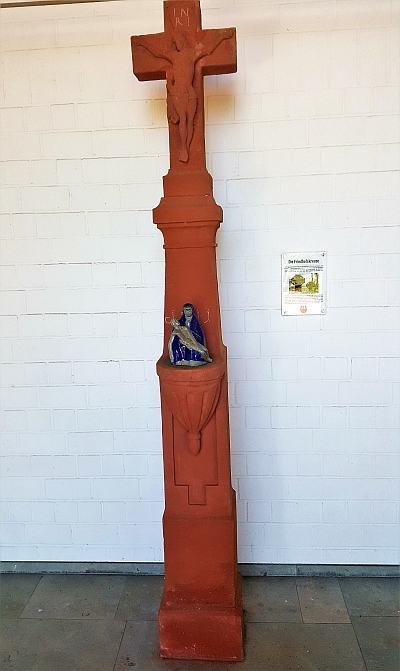 Das Kreuz in der Aufbahrungshalle stand ursprünglich auf dem alten Friedhof an der Westseite der Jakobuskirche. An ihm wurden an den Totengedenktagen die Friedhofsgebete gesprochen. - Weil das Kreuz meist im Schatten stand, war es stark verwittert. Deshalb wurde es bei der Friedhofsauflösung restauriert und erhielt beim Bau der Friedhofshalle seinen jetzigen Standort. [1]