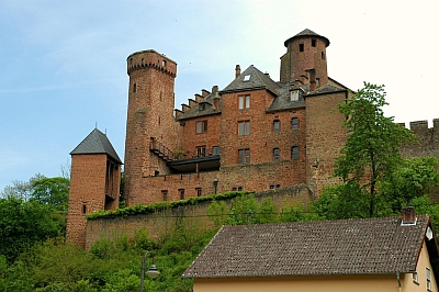 > Mittelalterliche Wehranlage des 14. Jahrhunderts, Bergfried und barocker Kapelle auf langgestrecktem, von der Prüm umflossenen Bergrücken, eine der größten noch bewohnten Eifelburgen.