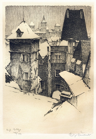 Bild 1: Lithografie von Fritz Quant: "Steipenbering" in Trier, Maße: 255 mm x 175 mm, ca. 1920. Von Fritz Quant - Private collection, Gemeinfrei, https://commons.wikimedia.org/w/index.php?curid=94843487