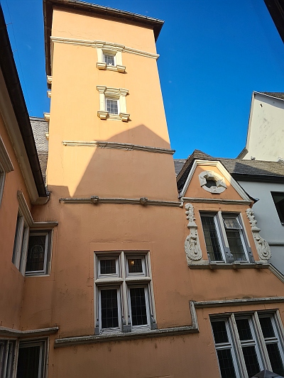 Hinter Steipe und Rotem Haus, einen engen und malerischen Hof umschließend, das unzerstört gebliebene Haus Zum Hirtzhorn (= Hirschhorn) mit quadratischem Treppenturm, der 1559 bezeichnete Sturz (Kopie) mit Wappenschilden und Spruchband. [2]