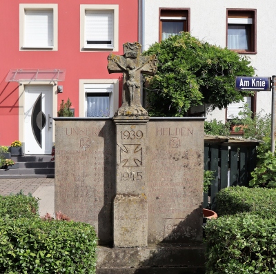 An der Abzweigung der Straße Am Knie von der Pellinger Straße aus befindet sich ein Wegekreuz aus hellem Sandstein, mit eingearbeitetem Korpus, die Kreuzecken verbreitert und mit Rocaillen besetzt, am Fuß mit dem Jahr 1766 datiert. Es ist der Überlieferung nach anlässlich der Überwindung einer Pockenepidemie im alten Ortsmittelpunkt aufgestellt.