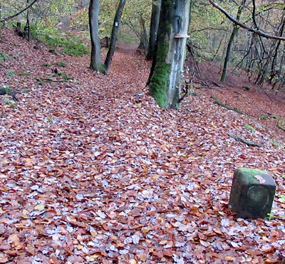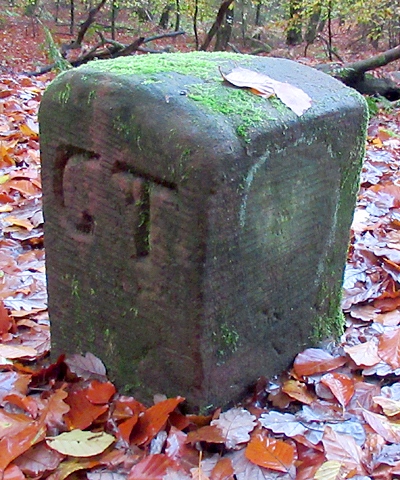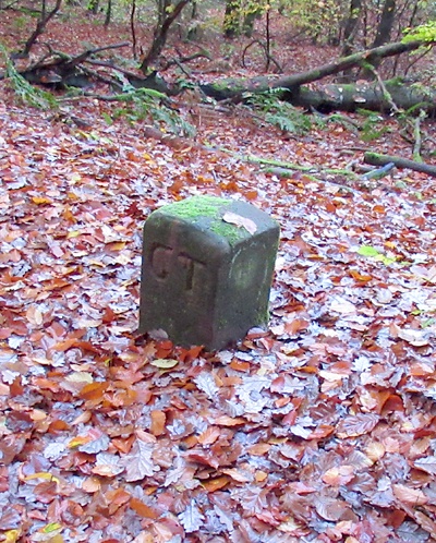 Auf diesem Waldwegabschnitt sind mehrere dieser Grenzsteine "GT" entlang der Gemeindegrenze Trassem/Saarburg zu entdecken.