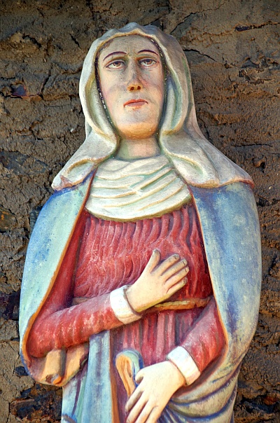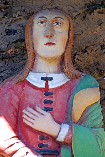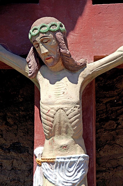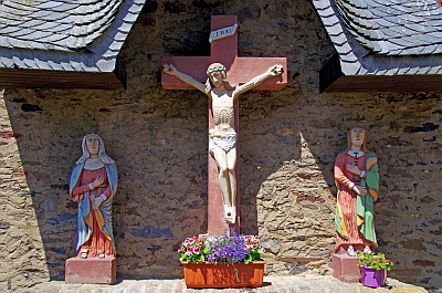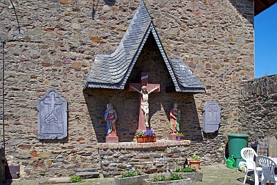 Große, naiv gearbeitete Kreuzigungsgruppe von 1824 (Inschrift) und zwei Schiefergrabsteine aus der ersten Hälfte des 19. Jahrhunderts. [1]