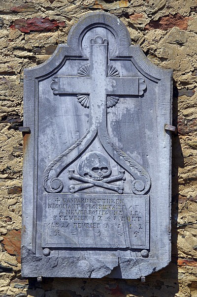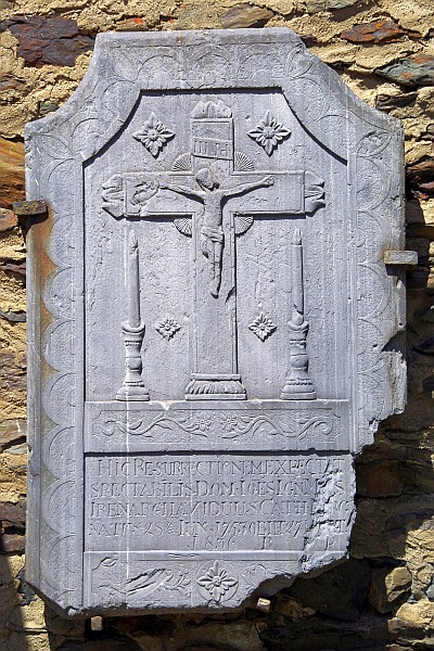 Große, naiv gearbeitete Kreuzigungsgruppe von 1824 (Inschrift) und zwei Schiefergrabsteine aus der ersten Hälfte des 19. Jahrhunderts. [1]