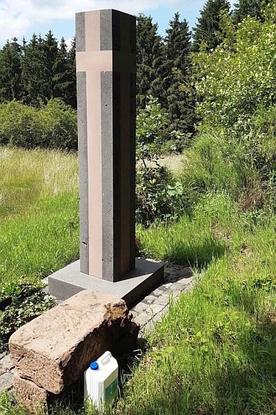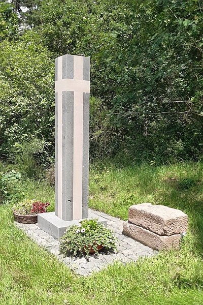 Der Wittlicher Steinmetz- und Bildhauermeister Sebastian Langner, der auch kürzlich die Gedenkstele für die Opfer der jüdischen Gemeinde Bitburgs geschaffen hat, hat ein Wegekreuz aus rotem Kyllsandstein und Mendiger Basaltlava entworfen. Die Stele bietet damit eine originelle und moderne Interpretation des Themas.