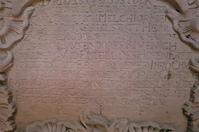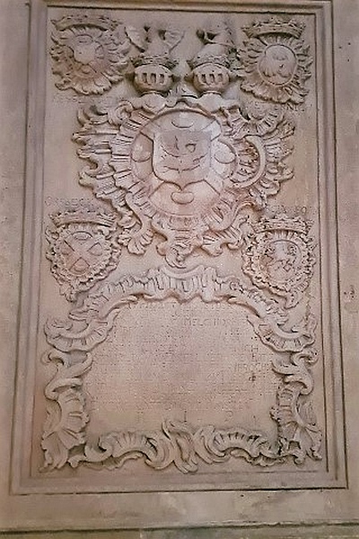 Denkmal des Freiherrn Carl Friedrich Melchior von Kesselstadt, gestorben 1751. Er war Sohn des aus Föhren stammenden Kasimir Friedrich von Kesselstatt und der Anna Klara Freiin von Metternich-Burscheid. Er vermählte sich mit Maria Isabella Theresia, Freiin von und zu Frens und baute 1740 bis 1745 das der Kirche gegenüber liegende Palais Kesselstatt. [1]