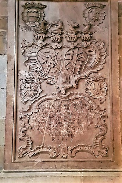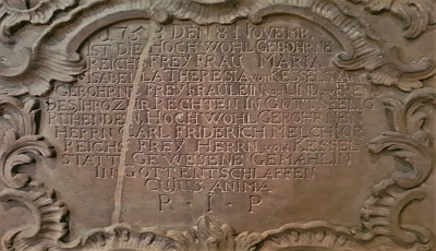 Links neben dem Haupteingang, in der Taufsteinnische das Denkmal für die Freifrau Maria Isabella Theresia von Kesselstadt, geborene Freiin von Frens, gestorben am 8.11.1758. Sie war verheiratet mit dem Freiherrn Carl Friedrich Melchior von Kesselstatt. [1]