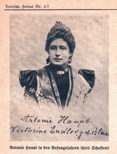 Benannt nach der in Trier geborenen Heimatschriftstellerin Antonie Haupt (1853-1932) die mit bürgerlichem Namen Victorine Endler geb. Bleser hieß. [1]