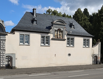 Südlich vom Haupttor liegt die übliche kleine Pforte für Fußgänger, daran anschließend das Torhaus, in den Abteiakten mehrfach Gerichtsgebäude genannt. Das untere Stockwerk hat nach der Straße hin nur eine Luke und den vorspringeneden Ausguck. In der Mitte setzt ein Zwerchgiebel mit der Jahreszahl 1717 und den Statuen der heiligen Eucharius, Valerius und Maternus an. [2]