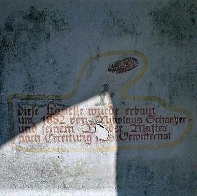 1882 wurde an einem Feldweg westsüdwestlich der Stadt die schlichte Kapelle, ein nach Süden offener Putzbau auf Hausteinsockel, duch Nikolaus Schaeffer und seinen Bruder Mattes nach "Erettung aus Gewitternot" zu Ehren der Muttergottes errichtet.