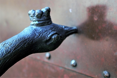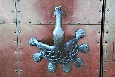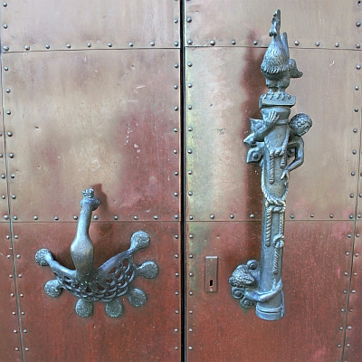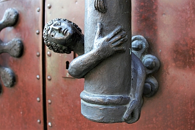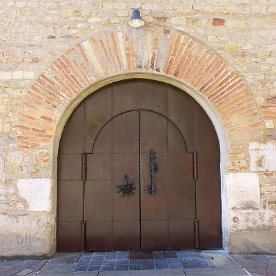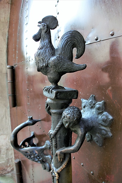 Das [...] Portal des 11. Jahrhunderts wurde mit kupferbeschlagenen Holzflügeln versehen. Wilhelm Jungherz (Köln, jetzt Limburg) modellierte die Form der in Bronze gegossenen Türgriffe mit dem Pfau und der Geißelsäule mit Hahn. [1]
