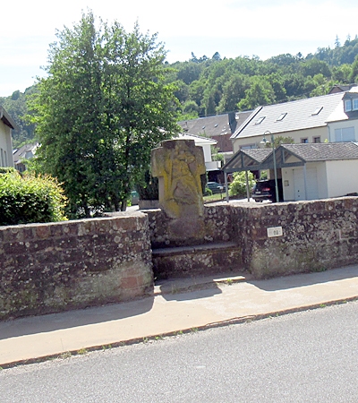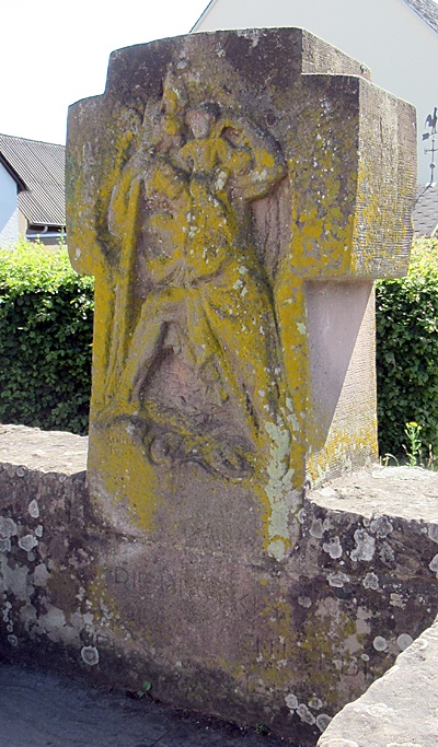 Steinkreuz / reliefierte Skulptur auf Brücke K 46 über den Bendersbach. Motiv und Inschrift am Sockel nur noch schwer zu entziffern. [1]