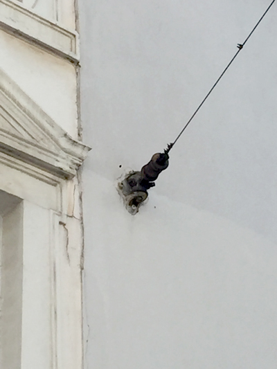 Am Eckhaus Brotstraße/Jesuitenstraße sind noch Aufhängungen für Kabel der ehemaligen elektrischen Straßenbahn zu erkennen. [1]