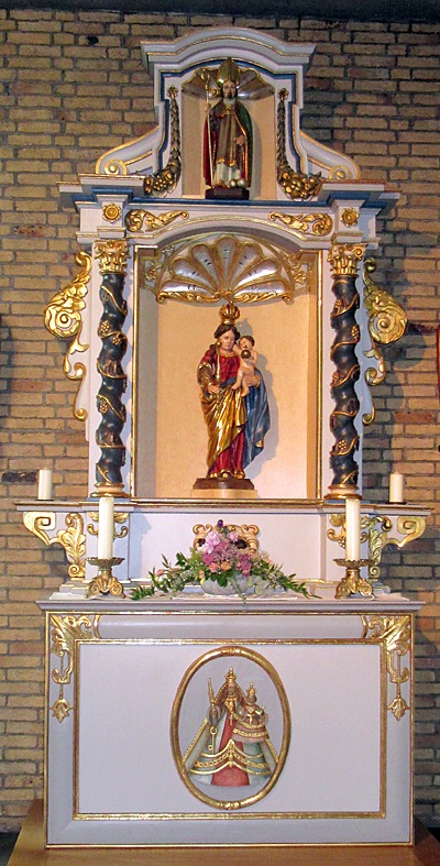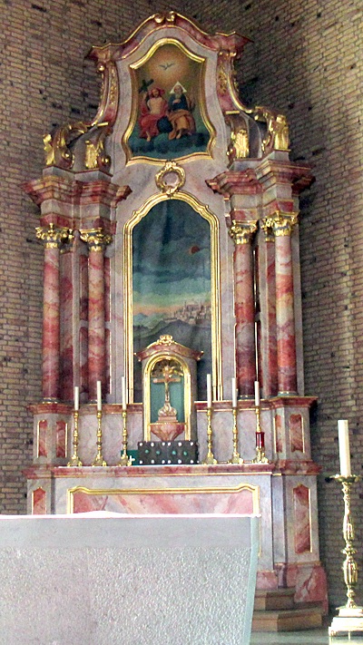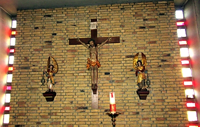 Saalbau mit schiffsbugartig vorspringendem Chor und flachgedeckten Abseiten, freistehender Turm, 1961/62, Architekt Hans Geimer, Bitburg; mit Ausstattung; ortsbildprägend. [1]