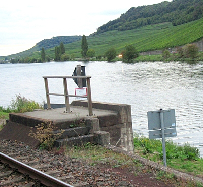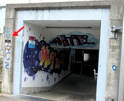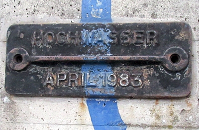 Hochwassermarke Bahnunterführung Nittel, datiert April 1983. [1]
